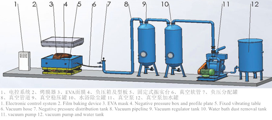 1. Electronic control system 2. Film baking device 3. EVA mask 4. Negative pressure box and profile plate 5. Fixed vibrating table 6. Vacuum hose 7. Negative pressure distribution tank 8. Vacuum pipeline 9. Vacuum regulator tank 10. Water bath dust removal tank 11. vacuum pump 12. vacuum pump and water tank